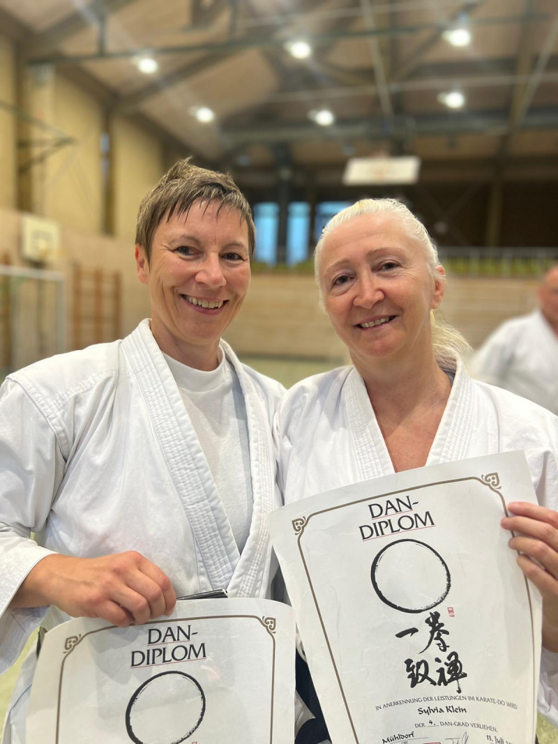 Am Samstag, den 13.07.24 fandenim Rahmen des Karate-Lehrgangs in Mühldorf am Inn auch wieder DAN-Prüfungen statt. Hierbei stellten sich Sylvia Klein und Stefanie Eser unter den erfahrenen Augen von Sensei Fritz Oblinger, Lothar Ratschke und Albert Patzelt erfolgreich der Prüfung zum 4. DAN bzw. 5. DAN. Vorausgehend stand viel Arbeit und intensives Training, bei dem der Spaß aber auch nicht zu kurz kam. Ein großer Dank geht an Andreas Schwarze, der sich als Prüfungspartner für beide zur Verfügung gestellt hat und auch einiges abbekommen hat. Anschließend wurde selbstverständlich auch noch etwas gefeiert.